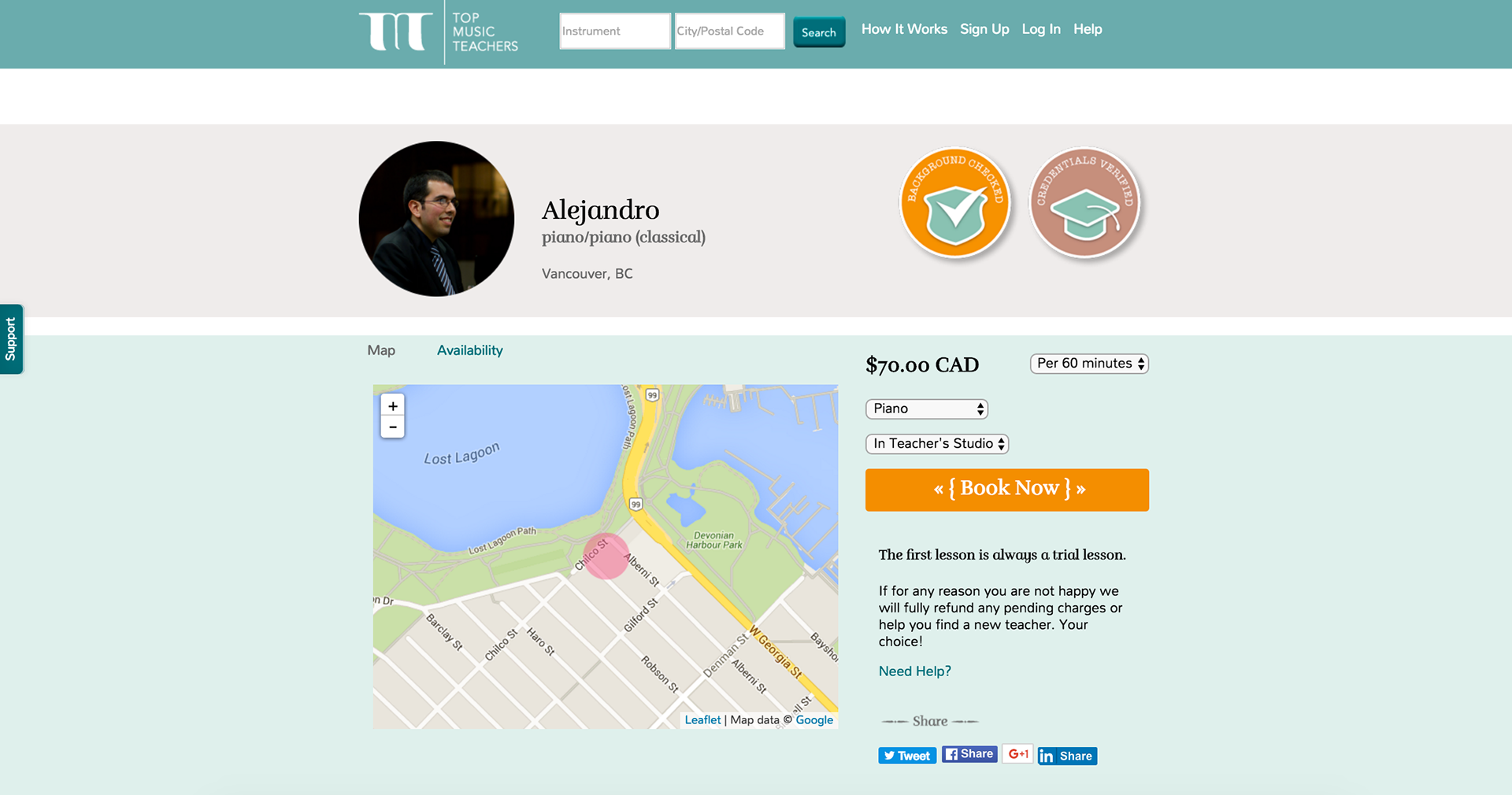Top Music Teachers (TMT) is an online music lessons marketplace. TMT offers benefits for both students and for teachers. They combine the convenience and cost of private teaching with the advantages of belonging to a real musical community. The TMT marketplace was a startup I co-founded, where I got to apply a wide variety of product design skills, along with lean entrepreneurship principles.